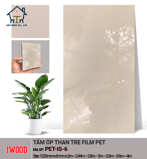 Tấm ốp than tre iWood bề mặt Film PET là lựa chọn hoàn hảo cho những ai yêu thích sự tinh tế và bền bỉ trong không gian sống. Với lớp phủ Film PET cao cấp, bề mặt tấm ốp không chỉ bóng mịn, sắc nét mà còn chống trầy xước, chống ẩm, chống bám bẩn hiệu quả